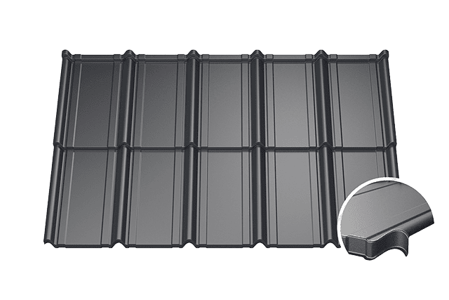 Claro Modular to blachodachówka modułowa o minimalistycznym, płaskim profilu, która idealnie wpisuje się w aktualne trendy architektoniczne. Równe linie i dopracowane przetłoczenia tworzą eleganczny, spójny wygląd dachu, podkreślając nowoczesny charakter budynku.