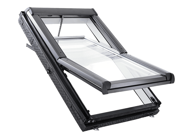 Roto Designo R4 Tronic to elektrycznie sterowane okno dachowe z osią obrotu w połowie wysokości, idealne do trudno dostępnych miejsc i nowoczesnych poddaszy.
